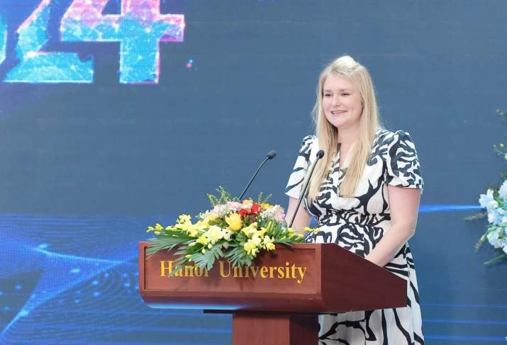 Đại diện Đại sứ quán Australia tại Việt Nam, bà Freya Kaine – Tham tán Giáo dục, đã phát biểu tại chương trình, chia sẻ niềm hạnh phúc và tự hào cùng người thân của các tân thạc sĩ. Bà nhấn mạnh rằng các học viên tốt nghiệp hôm nay chính thức trở thành thành viên của cộng đồng cựu sinh viên Australia, gia nhập mạng lưới với hơn 2,5 triệu cựu sinh viên trên toàn thế giới, trong đó có hơn 100.000 tại Việt Nam. Bà Freya tin rằng các tân thạc sĩ sẽ có những đóng góp lâu dài cho xã hội, kinh tế và chính trị của Việt Nam, và khuyến khích họ tự hào về con đường đã chọn để tiếp tục giảng dạy cho thế hệ tiếp theo của đất nước. Bà khẳng định giáo dục là một phần quan trọng trong quan hệ song phương giữa Australia và Việt Nam, đặc biệt khi hai quốc gia thống nhất nâng cấp quan hệ lên Đối tác chiến lược toàn diện vào tháng Ba năm 2024. Bà Kaine chúc mừng Trường Đại học Hà Nội và Đại học Canberra về sự hợp tác và cam kết của hai trường trong việc mang đến cho sinh viên bằng cấp quốc tế trong lĩnh vực giáo dục. Đây là minh chứng cho mối quan hệ hợp tác chặt chẽ giữa hai quốc gia, cùng làm việc, kết nối con người và thúc đẩy đổi mới sáng tạo.